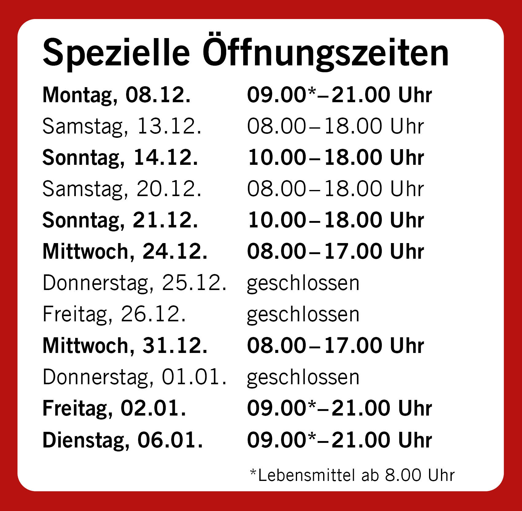 Sonntagsverkäufe und Öffnungszeiten im Seedamm-Center 2025