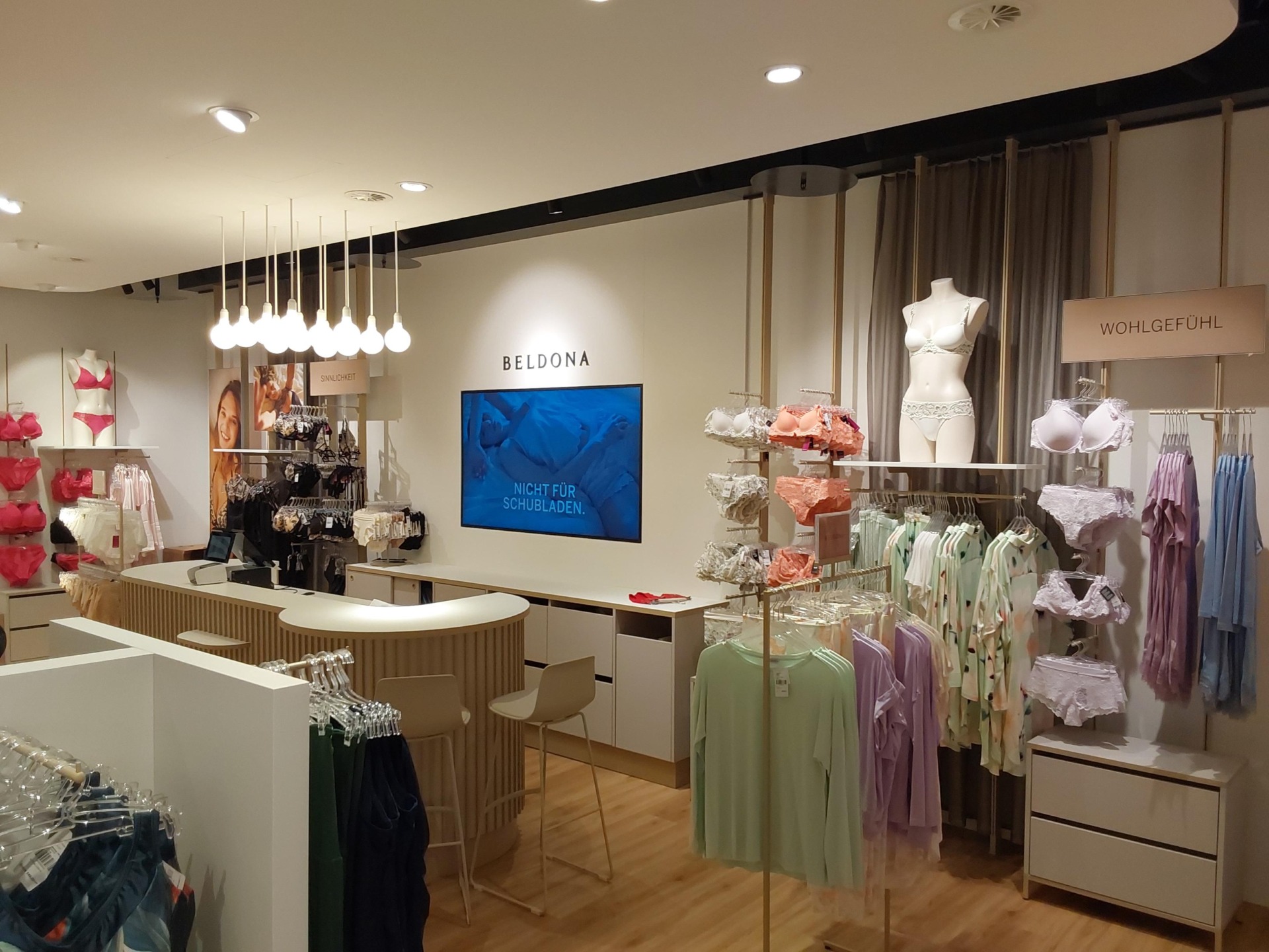 Neben den modischen Saisonkollektionen von „Beldona Design“ und einer attraktiven Auswahl an Basic-Produkten führt Beldona die Highlights bekannter Marken wie Chantelle, Marie Jo, Triumph oder Calvin Klein. Und damit alles garantiert passt, ist Beldona mit kompetenter Beratung stets für Sie da.